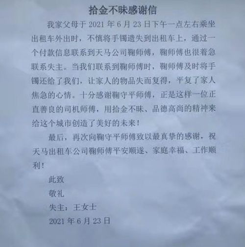 拾金不昧是中華民族的傳統(tǒng)美德,既是主流價值觀倡導(dǎo)“品德修養(yǎng)·潔身自愛”的人文瑰寶,更是華夏兒女傳承的非物質(zhì)文化遺產(chǎn)。2021年6月23號,一位老人在乘坐我們泰安旅汽天馬出租公司鞠守平師傅的出租車時不慎將拿去清洗的金手鐲遺落在車上。事發(fā)后,鞠師傅聯(lián)系不上失主,馬上將乘客遺失的物品交回公司,天馬出租公司劉經(jīng)理擔(dān)心失主著急,經(jīng)過多方聯(lián)系以及泰安市交通局出租辦的幫助,終于聯(lián)系上了正在著急的老人,并將物品歸還給失主。失主感動不已,說天馬出租的鞠師傅有一顆金子般的心,并委托朋友為鞠師傅送來了感謝信和錦旗。